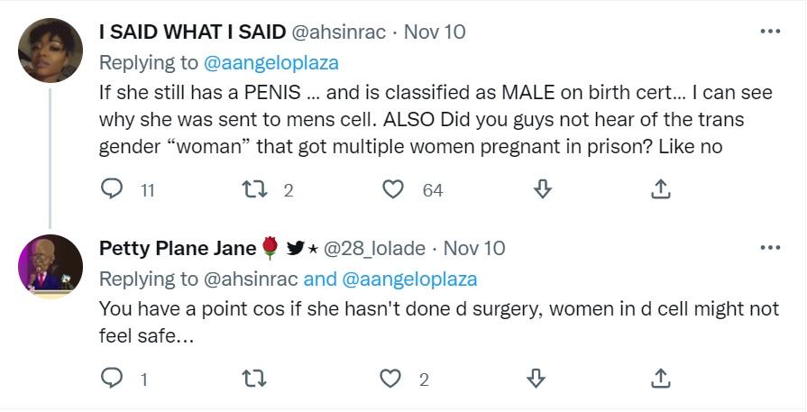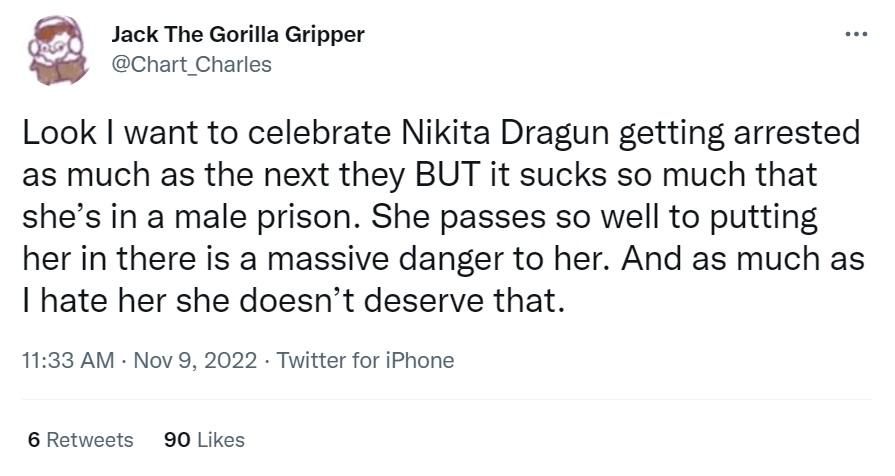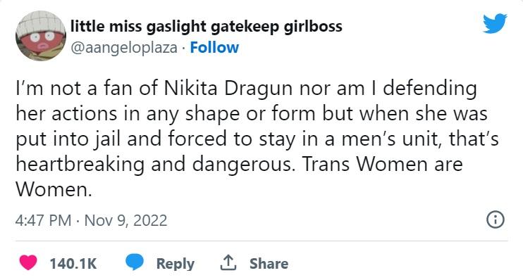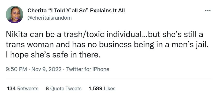 “尼基塔是垃圾,她確實(shí)有毒……但是她仍然是一個(gè)跨性別女,怎么可以把她放到男子監(jiān)獄。真希望她在那里沒事?!?/span>