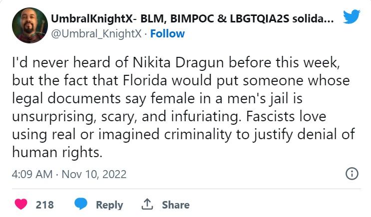 “這周之前,我從來沒聽說過尼基塔這個(gè)人,但佛羅里達(dá)州敢把一個(gè)法律文件上寫著是女性的人送到男子監(jiān)獄,實(shí)在是恐怖、令人憤慨,但同時(shí)又意料之中。法西斯們就喜歡用或真實(shí)或想象的罪行,來為剝奪人權(quán)辯護(hù)。”