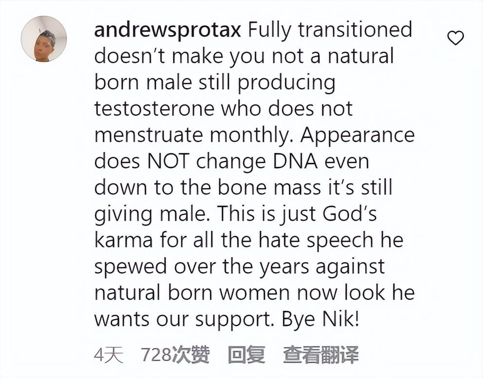 這些年,他經(jīng)常發(fā)表對自然女性的仇恨言論,如今真是天道好輪回。哈,他還想要我們的幫助。拜拜了,尼基塔?!?/span>