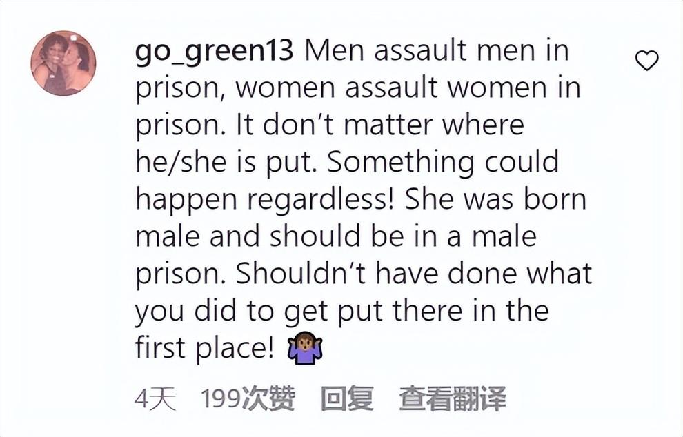 有人提到在美國監(jiān)獄,去哪里都危險(xiǎn),所以沒差別。“在美國監(jiān)獄,男人侵犯男人,女人侵犯女人,把他/她關(guān)哪里都沒差別。無論如何總會(huì)發(fā)生一些事!他出生時(shí)是個(gè)男人,那就應(yīng)該被當(dāng)作男人來對待。從一開始就不應(yīng)該做犯罪的事呀!”