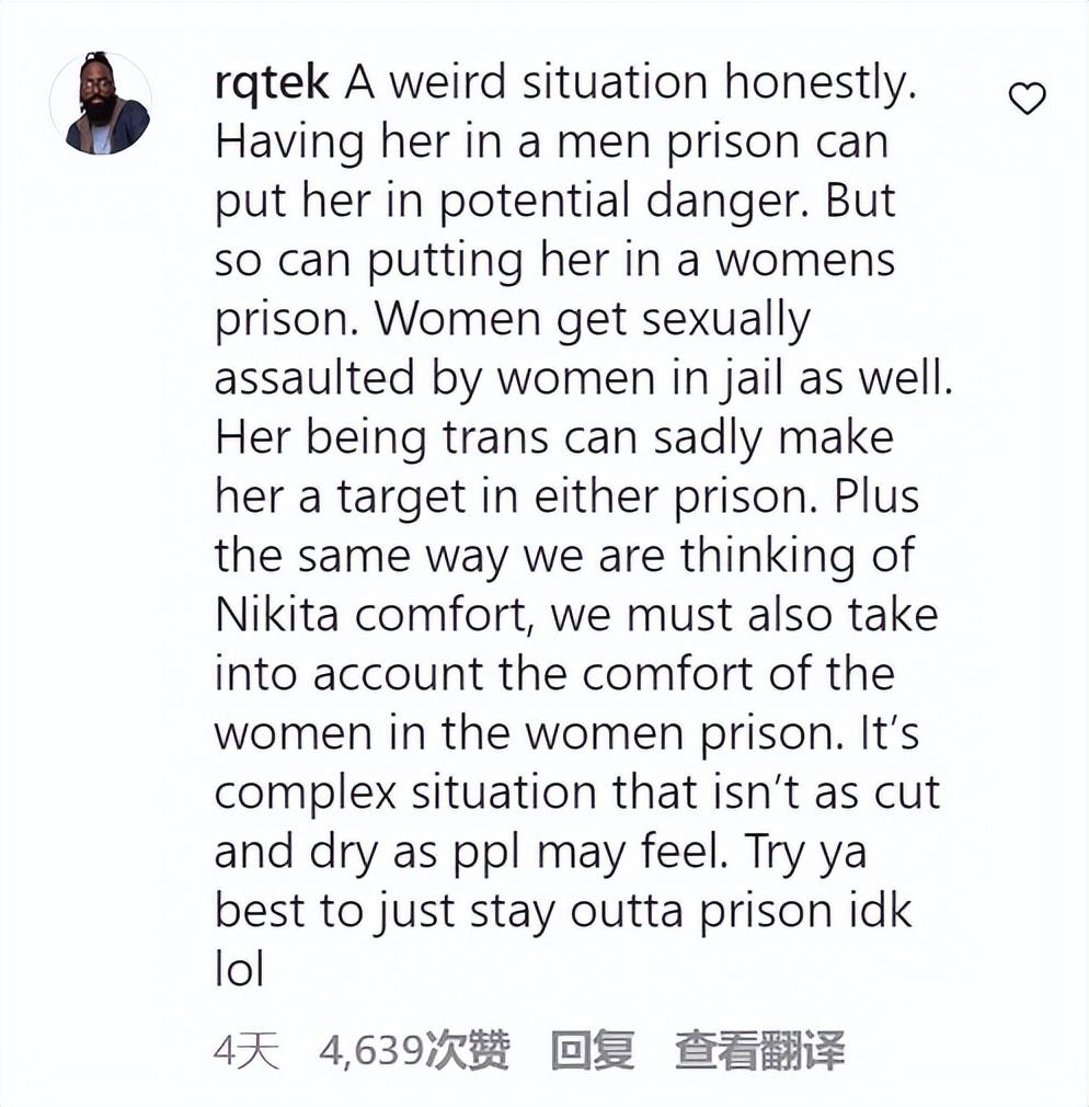 有人提到尼基塔面臨的困境?!艾F(xiàn)在這個(gè)情況真的很詭異。你把她放到男子監(jiān)獄吧,會(huì)給她帶去危險(xiǎn),但放到女子監(jiān)獄也會(huì)有危險(xiǎn)。監(jiān)獄里,女人也會(huì)被女性侵犯。作為一個(gè)跨性別者,不管在哪個(gè)監(jiān)獄她都會(huì)成為目標(biāo)。而且,我們不能只關(guān)心尼基塔的,還有其他女囚的。這情況真復(fù)雜,所以好的辦法就是,遠(yuǎn)離監(jiān)獄!”
