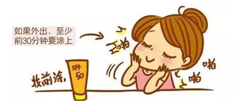 暴露于陽(yáng)光下15-30分鐘之前,就要將防曬霜涂抹在臉上身上;在開(kāi)始暴曬15-30分鐘之后,就要補(bǔ)涂防曬霜。研究表明“在20分鐘后補(bǔ)涂不太可能出現(xiàn)曬傷,但等到2小時(shí)后補(bǔ)涂可能會(huì)造成輕微的皮膚紅斑”。