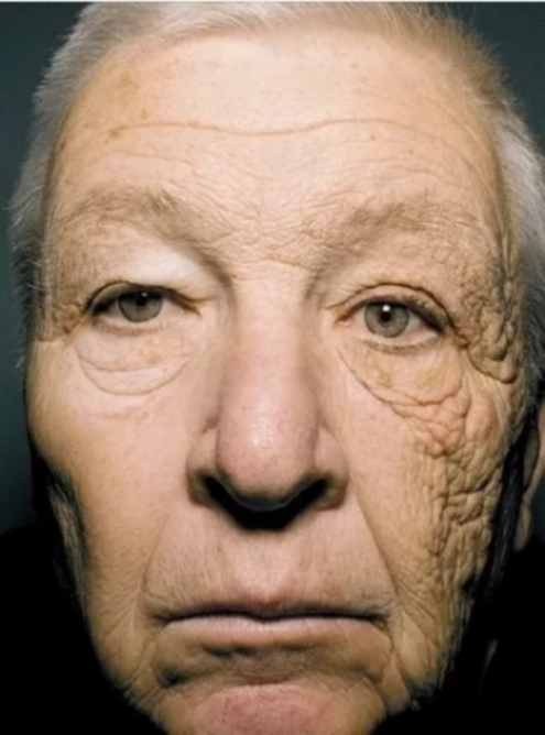 這位是69歲的卡車(chē)司機(jī),左臉受日曬時(shí)間較右臉顯著長(zhǎng)。25年來(lái),左臉光老化(皮膚增厚和皺紋等)狀況比右臉肉眼可見(jiàn)的嚴(yán)重。