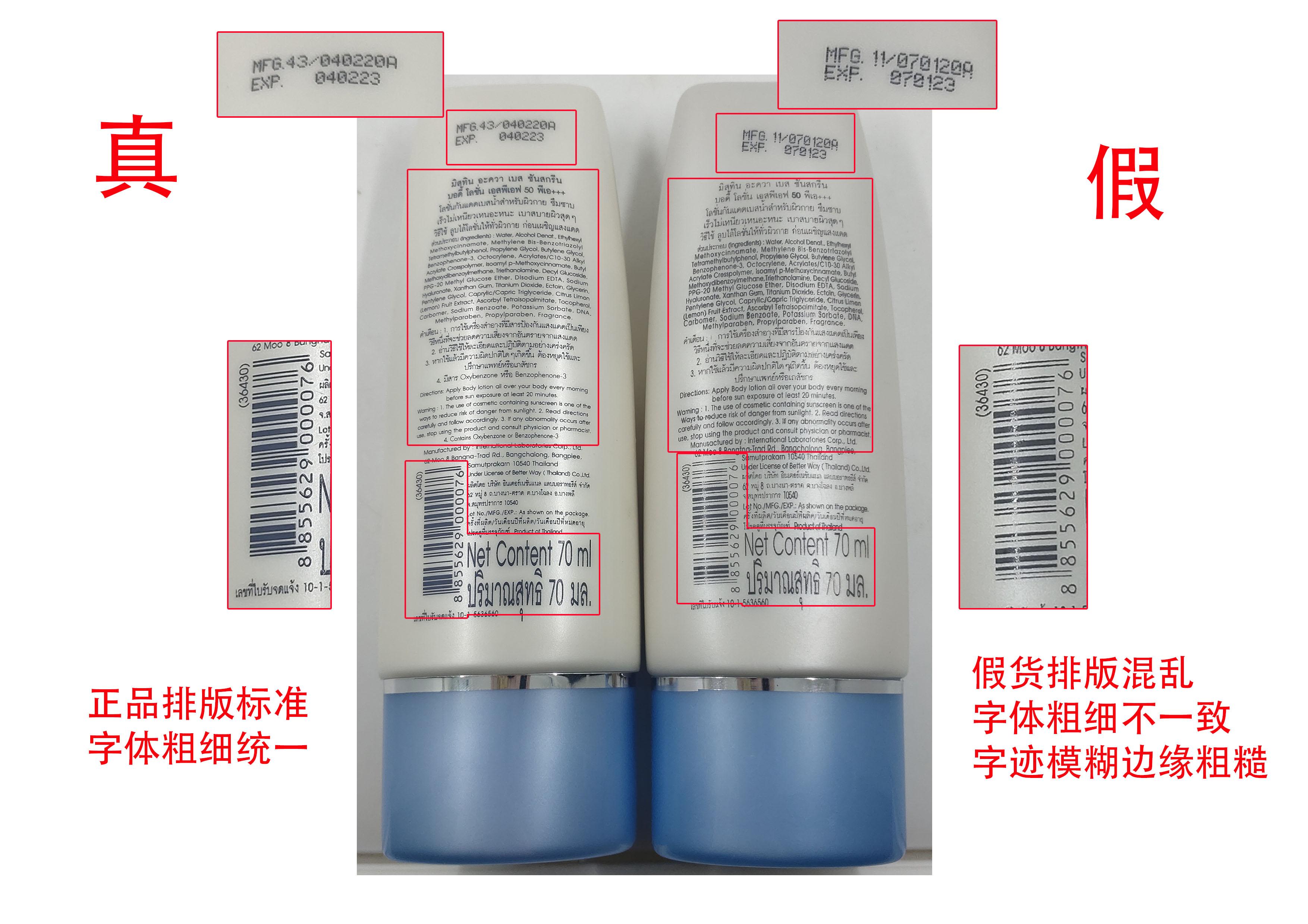 假貨瓶身背后排版混亂,字體印刷粗細不一致,邊緣粗糙,部分模糊不清