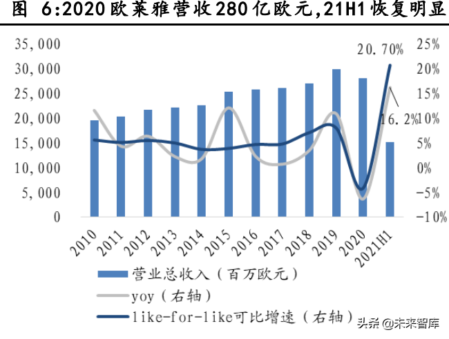 歐萊雅集團(tuán)為美妝龍頭,2020 年公司營(yíng)收、凈利潤(rùn)體量達(dá) 280、37 億歐元,在歐?;瘖y品市場(chǎng)份額達(dá) 9.8%位居第一;公司 2021H1 實(shí) 現(xiàn)營(yíng)收、凈利潤(rùn) 152、24 億歐元,同比+16%、30%。歐萊雅集團(tuán)目前已形 成專業(yè)美發(fā)、活性化妝品、化妝品、大眾化妝品四大事業(yè)部(2021H1 營(yíng)收占比 12%、13%、36%、39%),品類覆蓋護(hù)膚、彩妝、護(hù)發(fā)、染發(fā)、香 水(2021H1 營(yíng)收占比 42%、21%、15%、10%、9%),業(yè)務(wù)橫跨歐洲、北美、 北亞、南亞&中東&非洲、拉美地區(qū)(2021H1 營(yíng)收占比 32%、25%、31%、7%、 5%)。
