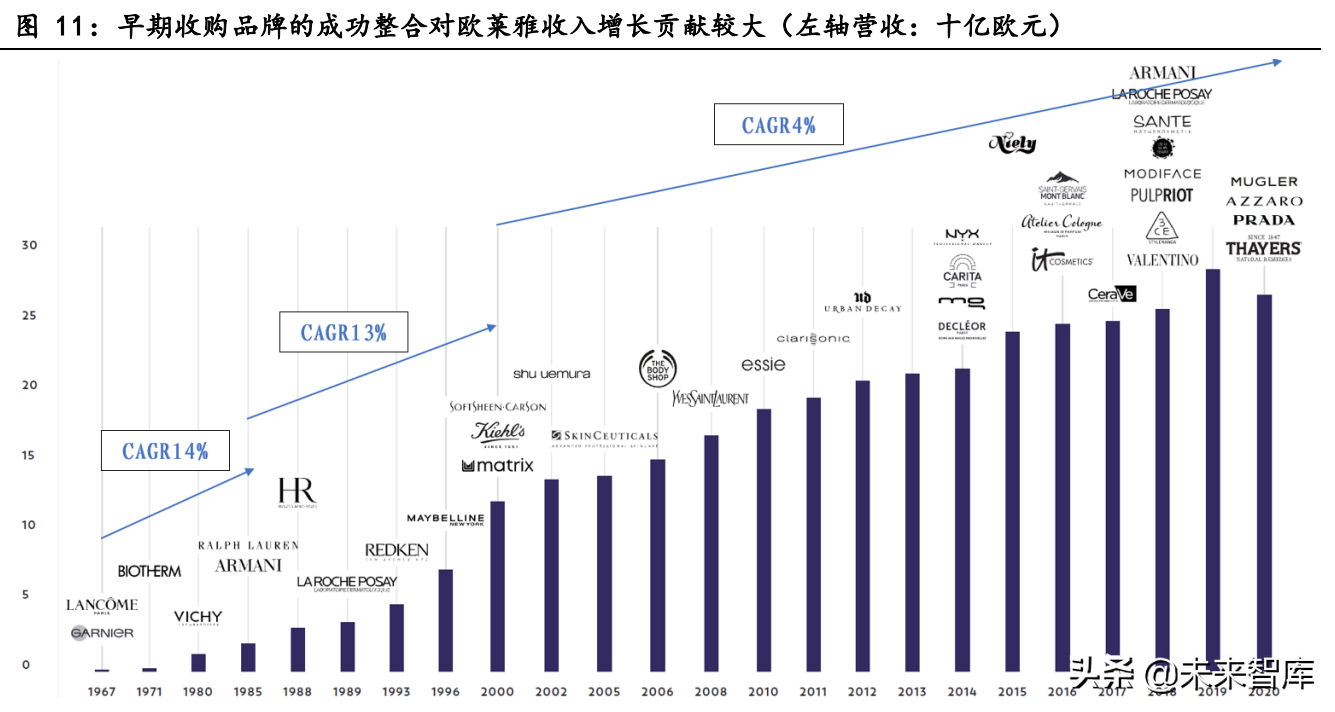4)多元化并購(gòu)(2001 至今):加速并購(gòu)補(bǔ)充細(xì)分定位及新興市場(chǎng)品牌 步入千禧年后,在集團(tuán)兩任 CEO 歐文中和安鞏的帶領(lǐng)下,歐萊雅集團(tuán)加 速并購(gòu)擴(kuò)充品牌矩陣,以滿足世界各地人群化妝品的新興需求,夯實(shí)集 團(tuán)作為化妝品業(yè)的霸主地位。此階段的收購(gòu)主要集中在護(hù)膚與彩妝領(lǐng)域, 也不乏香水以及洗臉儀、AR 化妝等新興科技方面的收購(gòu);收購(gòu)品牌的定 位則更加細(xì)分(如植村秀、Urban Decay、NYX、IT cosmetics、3CE 等 不同風(fēng)格的彩妝),或力圖通過(guò)收購(gòu)打開(kāi)新興市場(chǎng)(如在中國(guó)的一系列收 購(gòu)),此階段收購(gòu)的品牌目前體量不大,但為歐萊雅進(jìn)一步滿足細(xì)分人群 需求、拓寬客群做出了巨大貢獻(xiàn)。