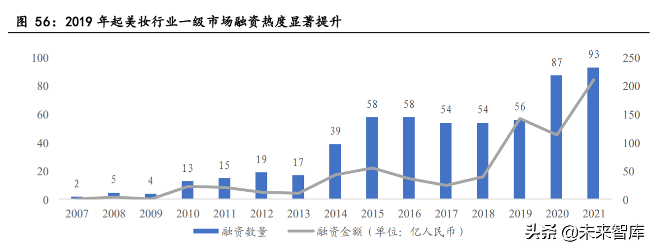2017 年以來(lái)化妝品類公司上市進(jìn)程加速,同時(shí)一級(jí)市場(chǎng)資本支持力度也 較大,頭部公司的資金實(shí)力可支撐較大規(guī)模的投資并購(gòu)。自 2017年珀 萊雅上市以來(lái),每年都有新的美妝公司登陸資本市場(chǎng),且上市融資規(guī)模 越來(lái)越大,2020 年美股上市的逸仙電商募資 6.17 億美元,約合 42.56 億人民幣,2021 年 A 股上市的貝泰妮融資 28.84 億元,且目前已在籌備 港股上市。同時(shí),毛戈平、敷爾佳、創(chuàng)爾生物等美妝公司均已發(fā)布招股 說(shuō)明書(shū),上海上美、巨子生物等已啟動(dòng) IPO 進(jìn)程,預(yù)計(jì)未來(lái)行業(yè)資本化 進(jìn)程有望進(jìn)一步加速,企業(yè)并購(gòu)的資金端限制有望逐漸被打破。