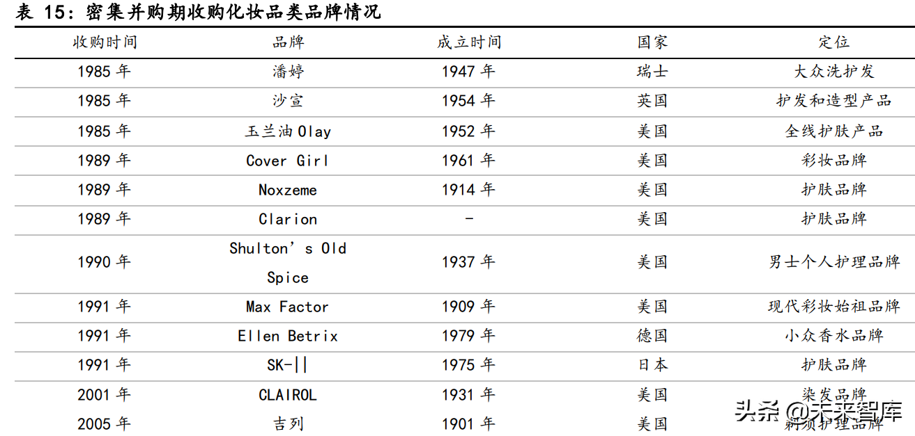 2)密集收購(gòu)期(1985-2008):收購(gòu)進(jìn)軍美妝品類,豐富個(gè)護(hù)品牌矩陣