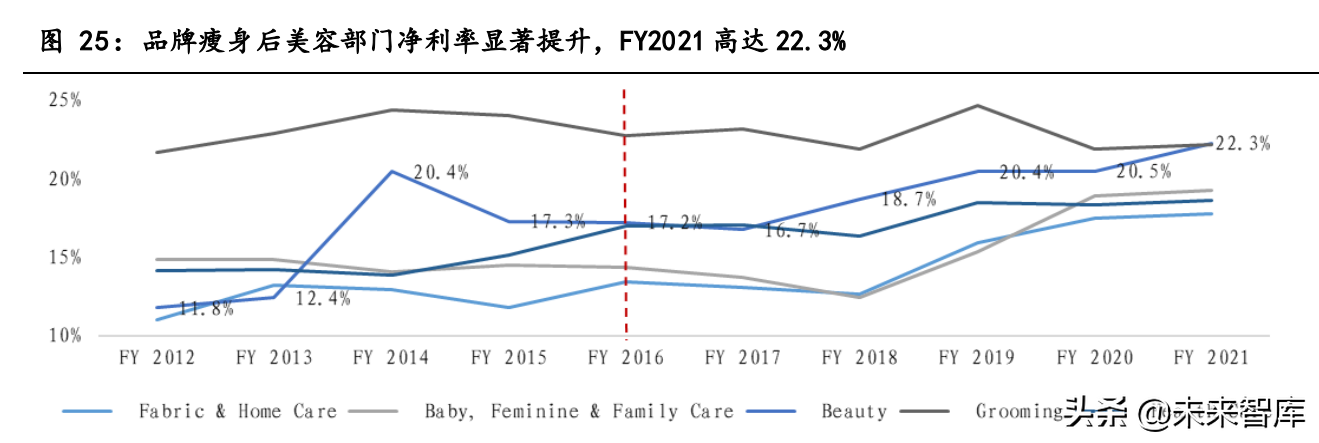 寶潔公司的美容部門(Beauty)包含潘婷、舒膚佳、海飛絲、OLAY、SKII 等知名品牌,以洗護(hù)類為主,F(xiàn)Y2021 部門營(yíng)收、凈利潤(rùn) 144、32 億美元 , 同比+8%、17%。
