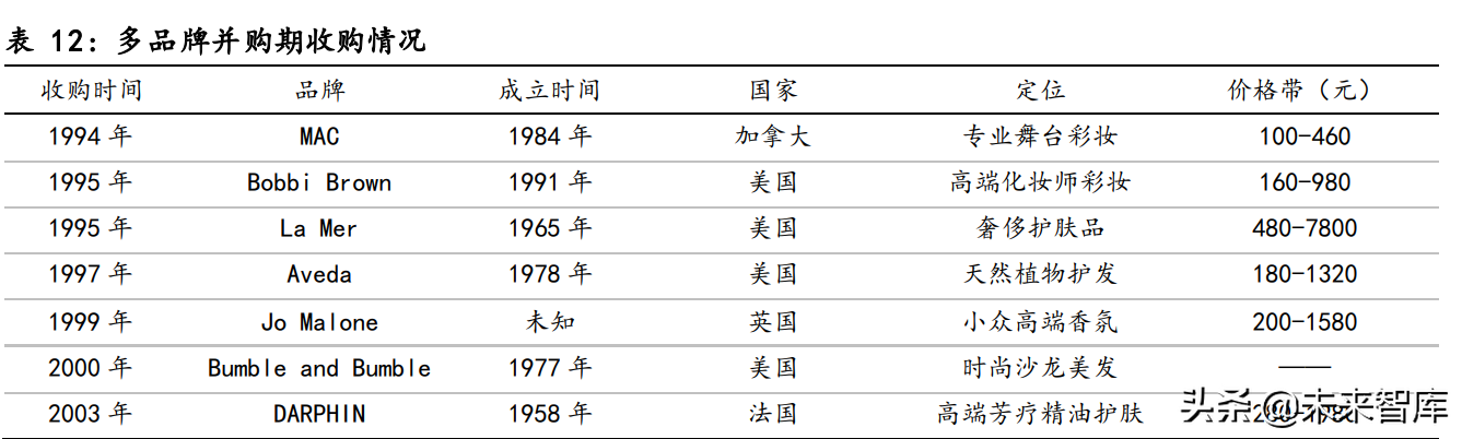 1995 年雅詩(shī)蘭黛于紐交所上市,同期開(kāi)啟外延并購(gòu)之旅。該時(shí)期收購(gòu)的 Lamer、MAC 經(jīng)過(guò)集團(tuán)整合培育后,現(xiàn)已發(fā)展成 10 億美金級(jí)品牌,Jo Malone、Aveda 和 Bobbi Brown 營(yíng)收體量也超過(guò) 5 億美金(FY2019)。