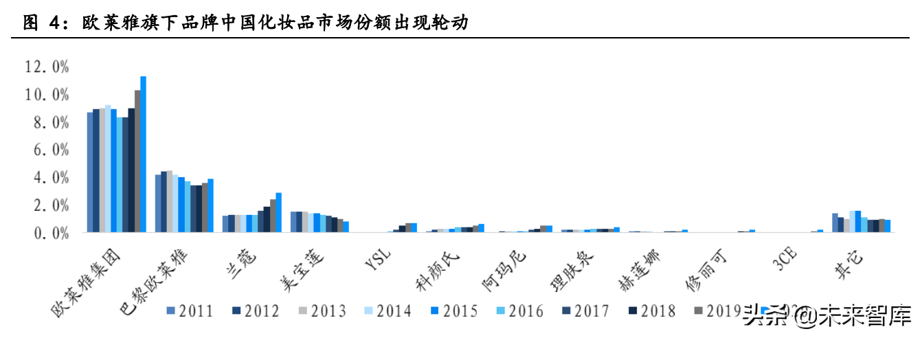 另外從單品牌角度來(lái)看,品牌有自己的生命周期,多品牌矩陣可以有 會(huì)降低單個(gè)品牌受客群、渠道、概念變化而經(jīng)營(yíng)不佳帶來(lái)的影響。如巴 黎歐萊雅因品牌老化 2013-2017 年中國(guó)化妝品市場(chǎng)份額下降 1.1pct,但 與此同時(shí)歐萊雅其他子品牌表現(xiàn)穩(wěn)健,集團(tuán)份額表現(xiàn)好于主品牌,特別是 2016 年起蘭蔻受益高端化份額提升。相對(duì)來(lái)講,品牌生命周期在 時(shí)尚屬性的彩妝品類、以年輕客群為主的大眾化妝品、以及部分渠 道驅(qū)動(dòng)型品牌上表現(xiàn)的較為。此外,定位的品牌矩陣可以防 止競(jìng)爭(zhēng)對(duì)手通過(guò)細(xì)分賽道切入彎道超車,具備一定的壓制作用。
