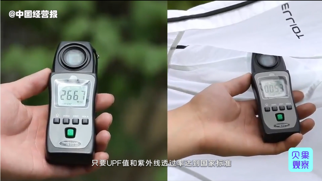 其實,對于防曬產(chǎn)品,是有標準規(guī)定的,紫外線防護系數(shù)UPF大于40,且紫外線透過率小于5%,才可稱為防紫外線產(chǎn)品。所以,防曬服并不是越貴越好,只要UPF值和紫外線透過率達到標準,就可以對人體起到比較好的防護作用。
