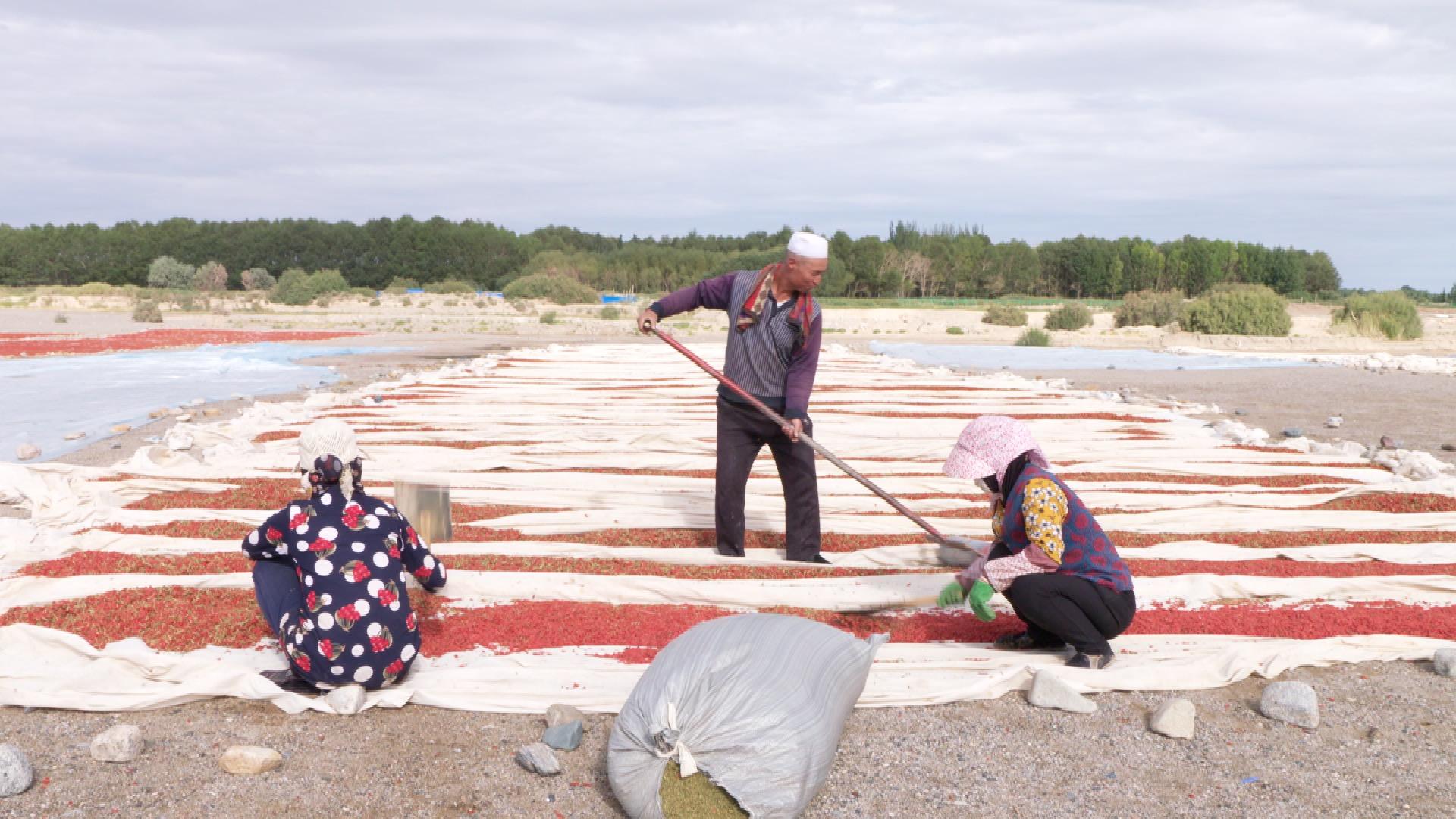 傍晚,起風了。小哥臉上帶著豐收的喜悅,將枸杞撒向空中,讓風把葉片吹走。反復多次,留下的只有枸杞。