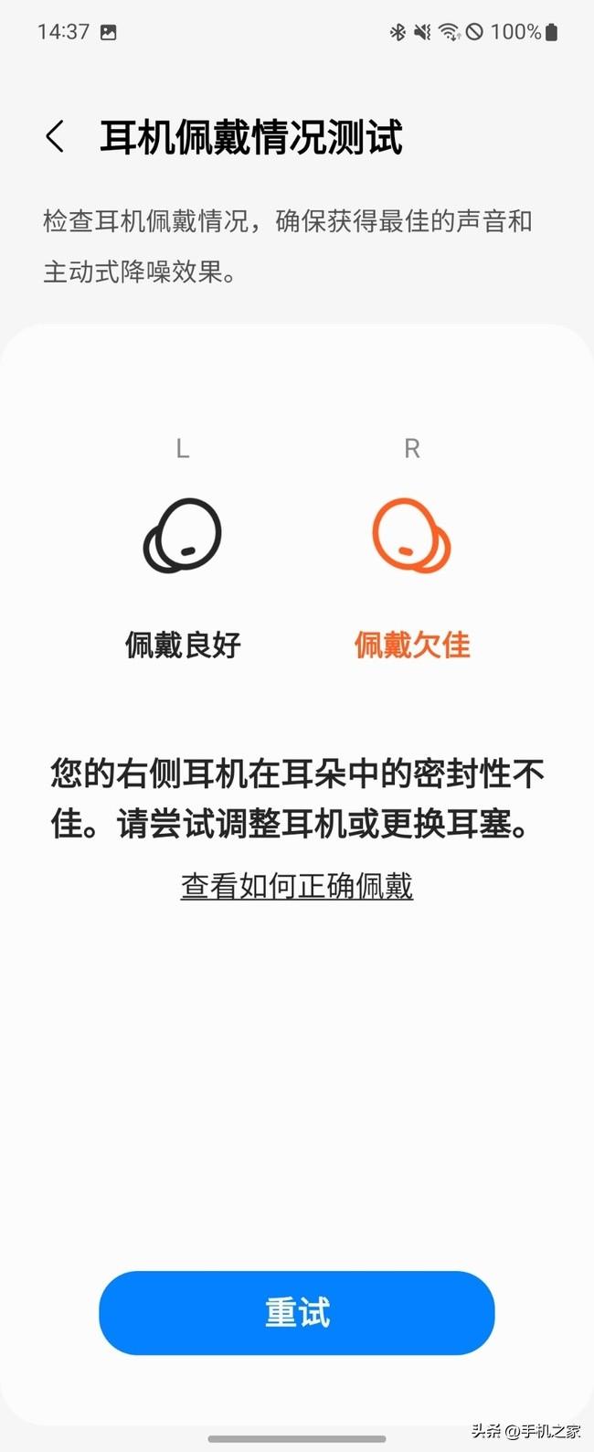 三星Galaxy Buds2 Pro的單耳5.5g的重量配上親膚的觸感,再加上經(jīng)過人體工學優(yōu)化后的造型設計,尺寸比Galaxy Buds Pro縮小15%。落實到實際佩戴時,像我這樣耳朵極為挑剔的用戶,戴上后也會感覺到滿意:耳機的導管長度適中,搭配合適的耳塞能將耳機牢牢的固定在耳道內(nèi)。配合新型通風孔和進氣格柵的設計,長時間佩戴也不會產(chǎn)生不適感。進入到手機的操作界面,我們還可以檢測耳機的佩戴果,以便能調(diào)整到佳的佩戴狀態(tài)。