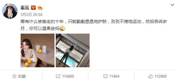 當很多人都在感嘆秦嵐的是“老天賞飯吃”時,她自己卻在微博上大方承認:“哪有什么被偷走的十年,只能勤勤懇懇地護膚,孜孜不倦地運動?!?/p>