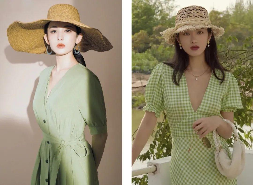 草帽的原色黃與V領(lǐng)連衣裙的田園綠可謂絕配,古力娜扎和楊采鈺都穿出了清新大方的感覺(jué)!