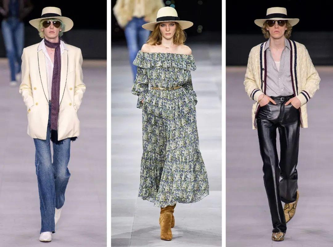 在Celine 2020春夏秀場(chǎng)上同樣出現(xiàn)了草帽的身影,其中成衣線的寬檐草帽設(shè)計(jì)以穹頂,柔美得體,男裝線的寬檐草帽則采用平頂,率性瀟灑,卻都體現(xiàn)出Hedi Slimane致敬上世紀(jì)60-70年代的復(fù)古情懷!