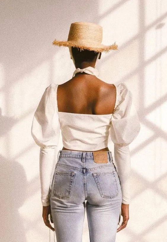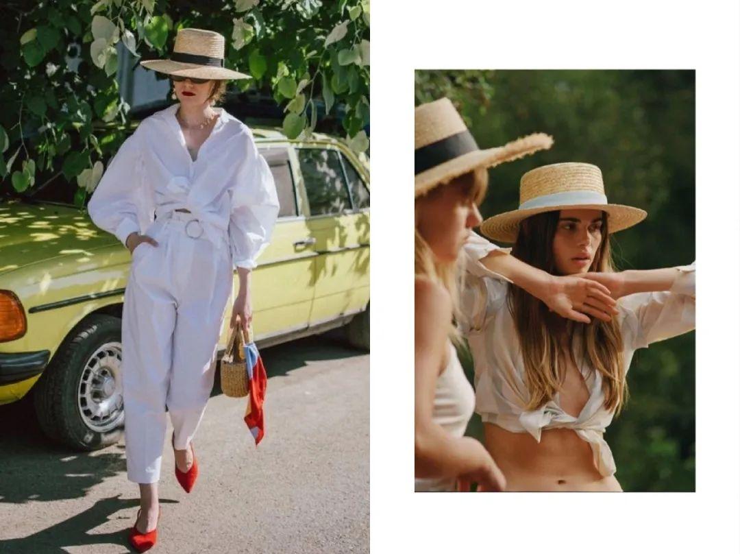 圓柱形平頂寬檐帽又昵稱為蛋糕帽,和下擺卷起打結(jié)的白襯衫CP值拉滿,小露性感!