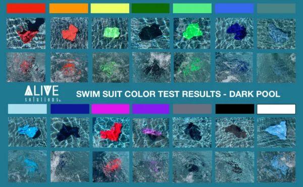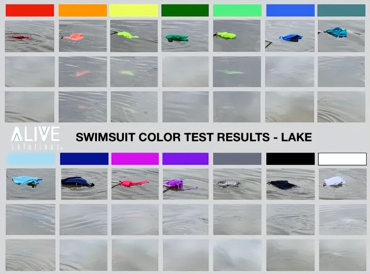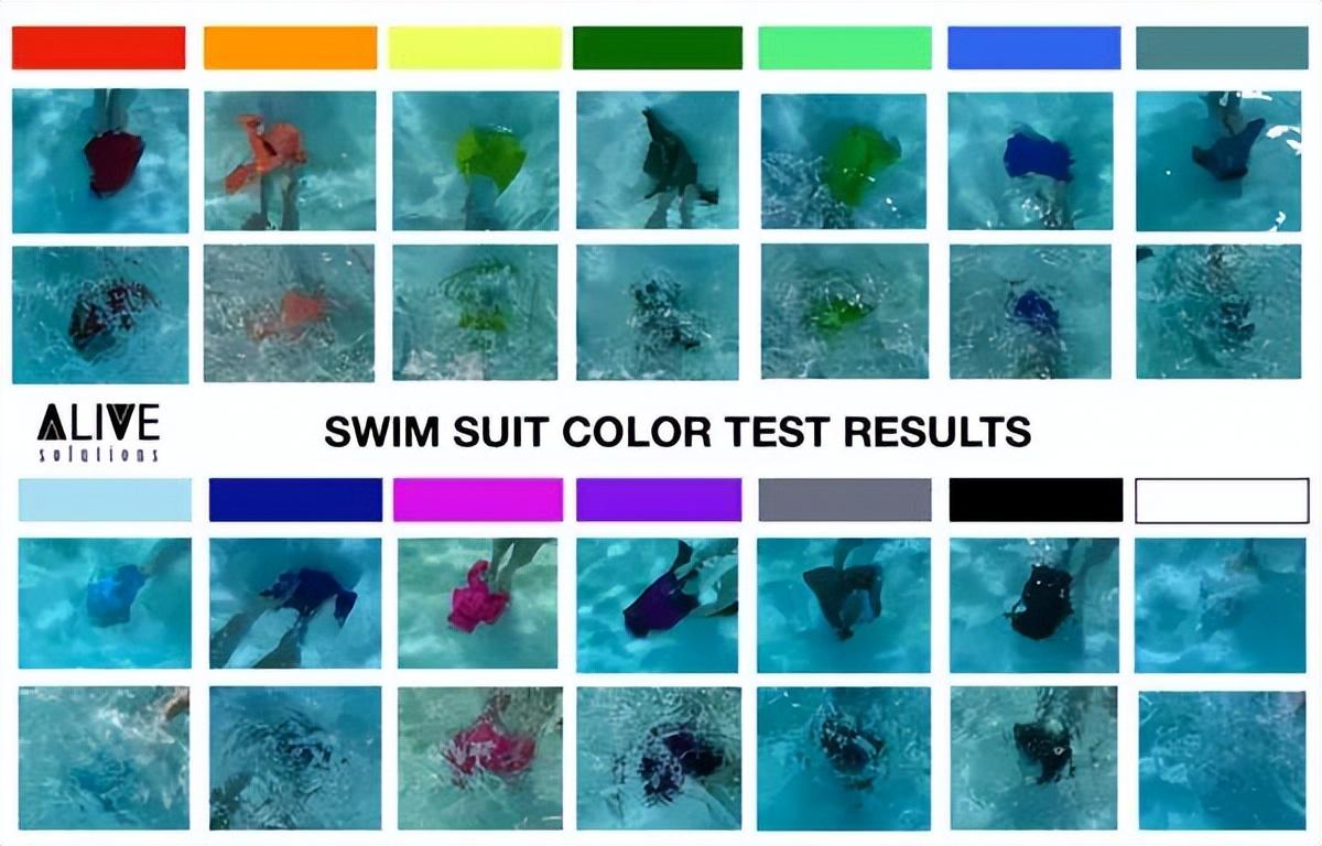 國(guó)外一家專業(yè)水上、培訓(xùn)和風(fēng)險(xiǎn)評(píng)估公司(Alive Solutions),測(cè)試了 14 件各種顏色的泳衣在深淺底色游泳池和湖中的度。