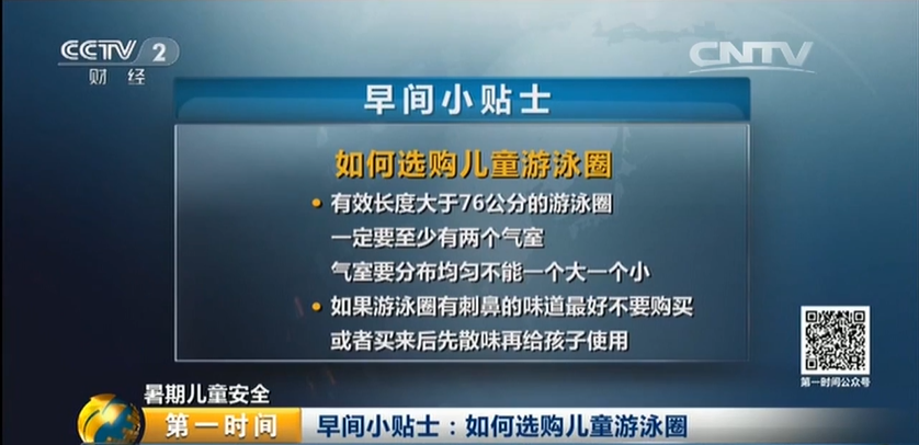 提醒,購(gòu)買(mǎi)游泳圈不能只看款式、尺寸,也不能只看它是否漏氣,重點(diǎn)還要看浮力,需要參考孩子的年齡和體重,選擇品牌游泳圈。