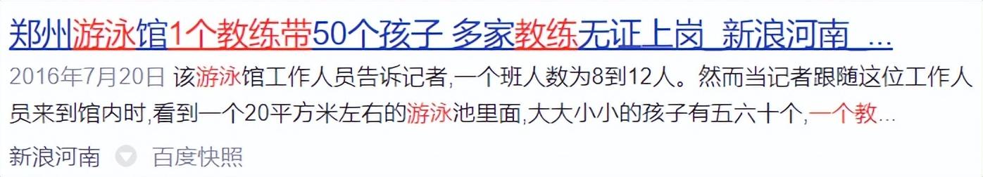 合肥8歲女孩,在僅有80公分深的泳池學(xué)游泳溺亡,他的教練,當(dāng)時(shí)帶了20多個(gè)孩子訓(xùn)練。鄭州這個(gè)一次帶50個(gè)孩子的,也是相當(dāng)“厲害”了,想想就很危險(xiǎn)。
