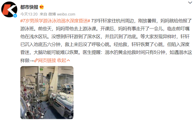 前一陣,湖南張家界,一7歲男孩在游泳培訓(xùn)班上課的時(shí)候溺水,被送進(jìn)了ICU。