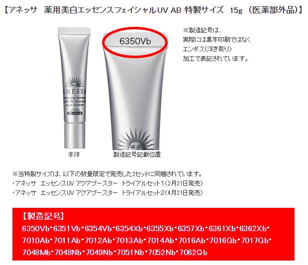 而另一款要回收的防曬霜就是國人熟悉的安耐曬了。這款安耐曬美白防曬霜是面部專用的,40g一支。不僅在日本本國販賣,超高的人氣也使它走向了海外。大家快對照下圖的制造編碼,檢查一下有木有中獎?