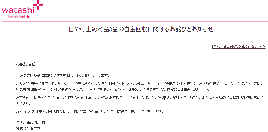 7月27日,日本資生堂官網(wǎng)發(fā)布了回收2款防曬霜的消息。并表示,這2款產(chǎn)品是在特定情況下制造出來的,使用感有一些粗糙,不符合資生堂的品質(zhì)標準。但產(chǎn)品的性和紫外線防御功能都沒有問題。