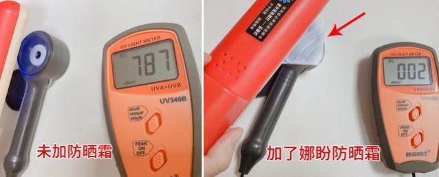 為此我們專門用紫外線燈做了一個測試:在沒有防曬的情況下,紫外線燈照射后的數(shù)值達(dá)到了700+