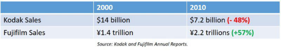 2000-2010年,膠片市場下降到不到10%,柯達(dá)的銷售額下降了48%,而曾經(jīng)60%的銷售額來自膠片的富士卻成功轉(zhuǎn)型,并在這十年內(nèi),收入增長了57%。