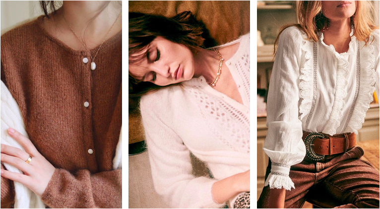 Sézane的衣服柔軟親膚,有著細(xì)致的蕾絲和紋理設(shè)計,實穿性很強(qiáng),是在略帶寒意的秋冬季節(jié)衣櫥里常備的老朋友~