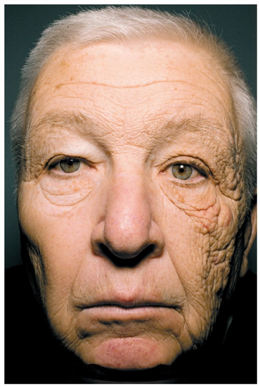 圖片中的男子是一位開了28年貨車的貨車司機(69歲)。28年間,太陽光透過貨車駕駛位左側(cè)的玻璃,照射在司機的左臉。從開貨車的第三年起,他就開始出現(xiàn)面部左側(cè)皮膚無癥狀增厚(過度角化)和皺紋,還伴有開放性粉刺、部分區(qū)域囊腫粉刺。這些都是典型的陽光過度暴曬癥狀。從照片上可以看出,他的右邊臉因為離車窗更遠(yuǎn),不容易被陽光直接照射,所以皮膚狀況好得多。