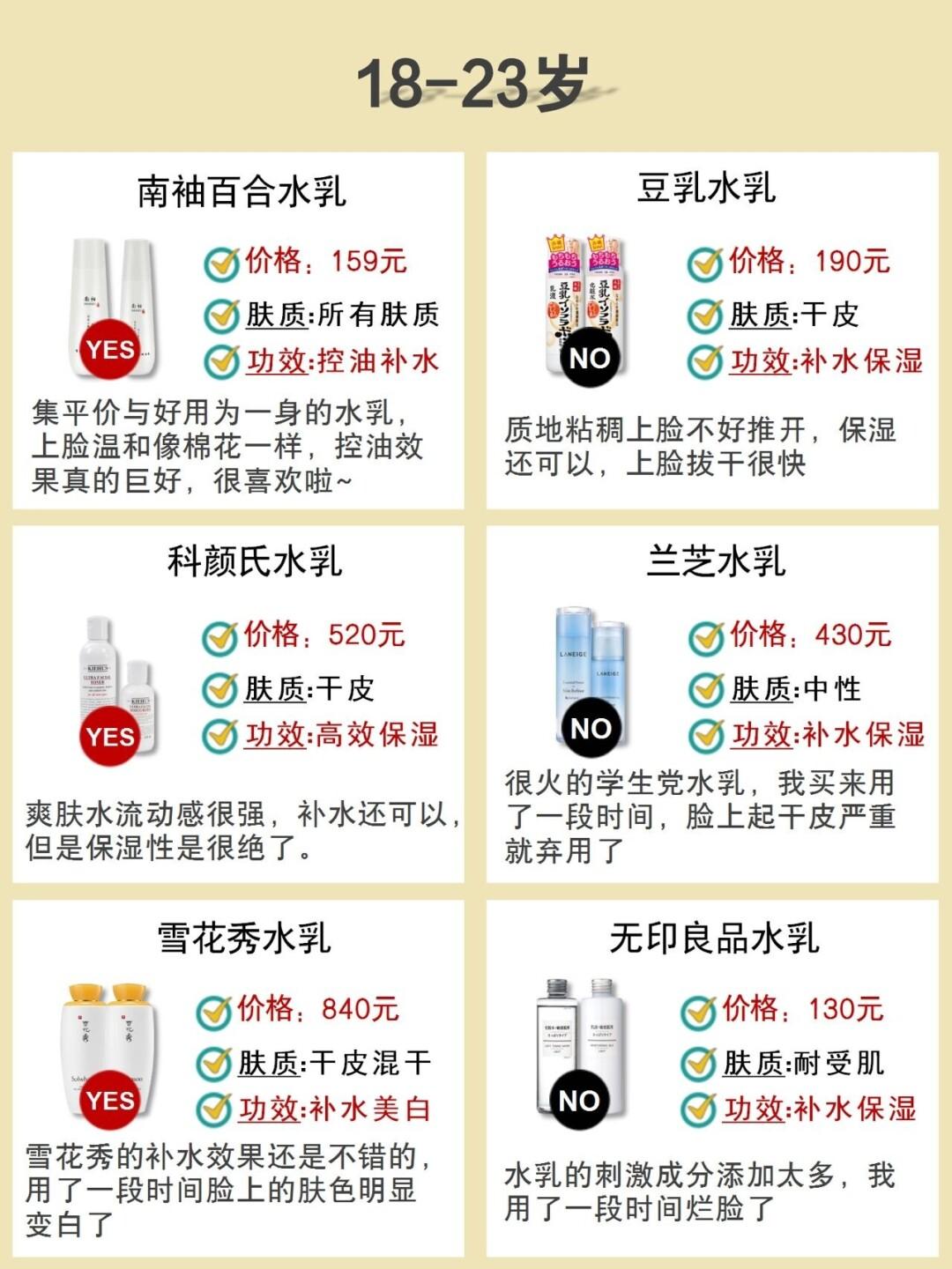 20~28歲:嘉蘭杜汀保濕面霜、雪花秀美白淡斑面霜、芙麗芳絲面霜、OLAY熬夜面霜、悅木之源面霜、雪肌精面霜