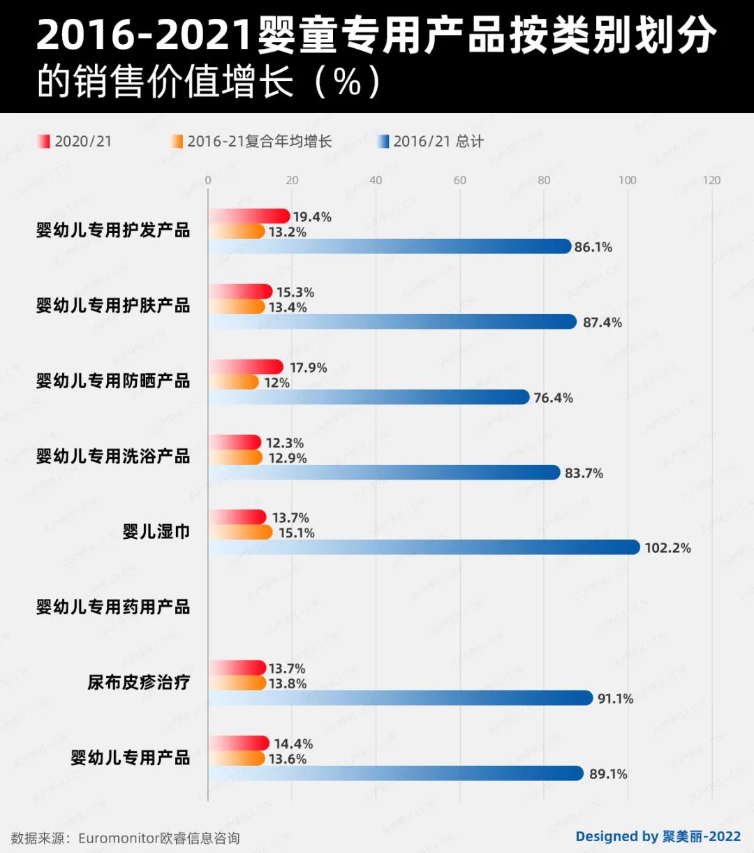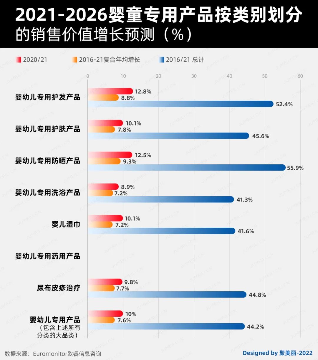 對于2021-2026年的各品類增長預測,如下圖,可以看到嬰童護發(fā)和防曬品類的增速都十分顯著,均在50%之上。