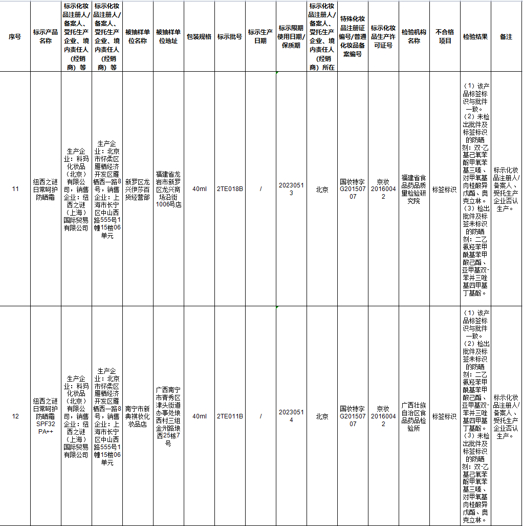 一批次標示名稱為紐西之謎日常呵護防曬霜SPF32 PA++、標示生產企業(yè)為科瑪化妝品(北京)有限公司、銷售企業(yè)為紐西之謎(上海)國際貿易有限公司、標示特殊化妝品注冊證編號/普通化妝品備案編號為國妝特字G20150707、標示批號為2TE011B的產品,被檢出標簽標識不合格,不合格項目為檢出批件及標簽未標識的防曬劑:二乙氨羥苯甲?;郊姿峒乎ァ喖谆p-苯并三唑基四甲基丁基酚;未檢出批件及標簽標識的防曬劑:雙-乙基己氧苯酚甲氧苯基三嗪、對甲氧基肉桂酸異戊酯、奧克立林。同時備注:標示化妝品注冊人/備案人、受托生產企業(yè)否認生產。