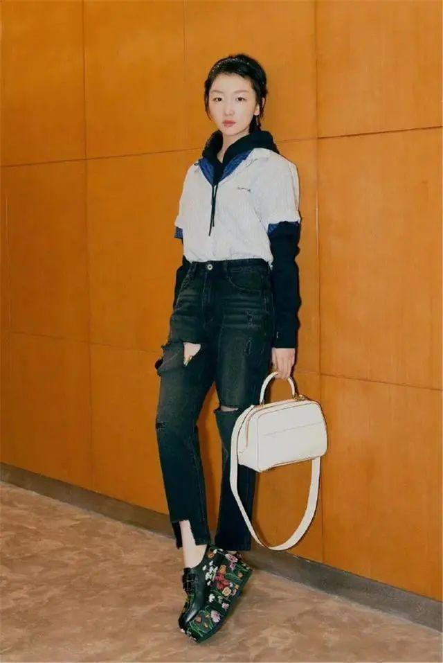 除了短裙和短褲,破洞褲也是很多人夏天愛(ài)不釋手的單品,破洞褲也和工裝褲一樣自帶設(shè)計(jì)感,但不同的是,破洞褲的設(shè)計(jì)感會(huì)使褲子更有朋克風(fēng),夏天穿也更清涼透氣,小個(gè)子女生就可以像周冬雨這樣選擇錐形破洞褲來(lái)搭配“防曬套裝”,更顯嬌小可愛(ài)。