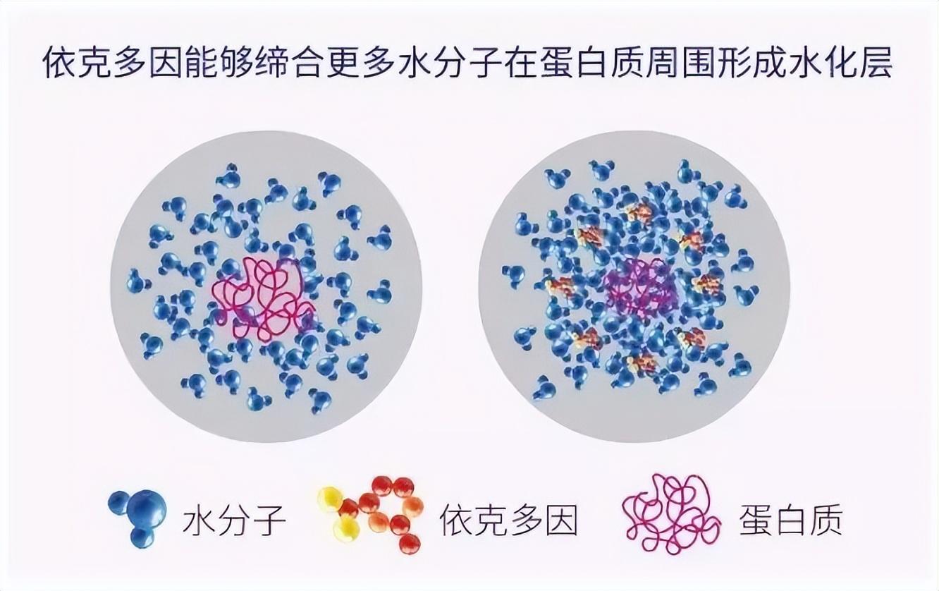 它自身超強(qiáng)的鎖水能力和特殊的結(jié)構(gòu),讓它具備很強(qiáng)的水分子絡(luò)合能力,一分子依克多因可結(jié)合4~5個(gè)水分子。