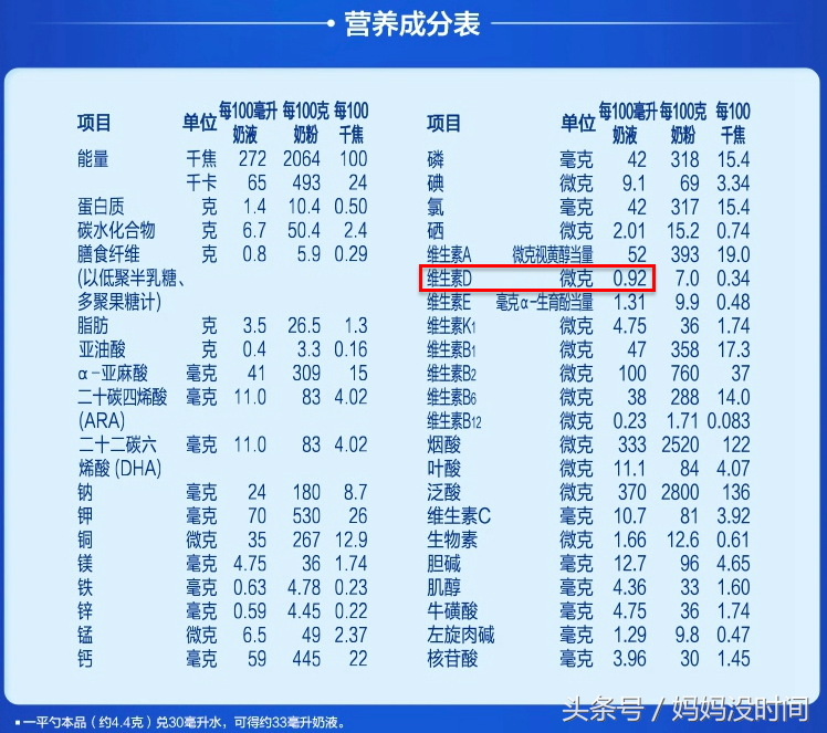 如何知道奶粉中添加了多少維生素D呢?很簡單,看奶粉外包裝上的營養(yǎng)成分表就行。