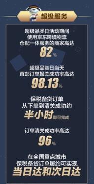 除了玩法精彩,品類日的服務(wù)也締造了一份搶鏡數(shù)據(jù),在活動(dòng)期間,使用京東跨境物流,倉配一體服務(wù)的商家高達(dá)82%,當(dāng)天直郵訂單報(bào)關(guān)高達(dá)98.13%,保稅備貨訂單從下單到清關(guān)成功約半小時(shí)即可完成,訂單清關(guān)高達(dá)96%,在全國重點(diǎn)城市的保稅備貨訂單履約可實(shí)現(xiàn)當(dāng)日達(dá)和次日達(dá)!
