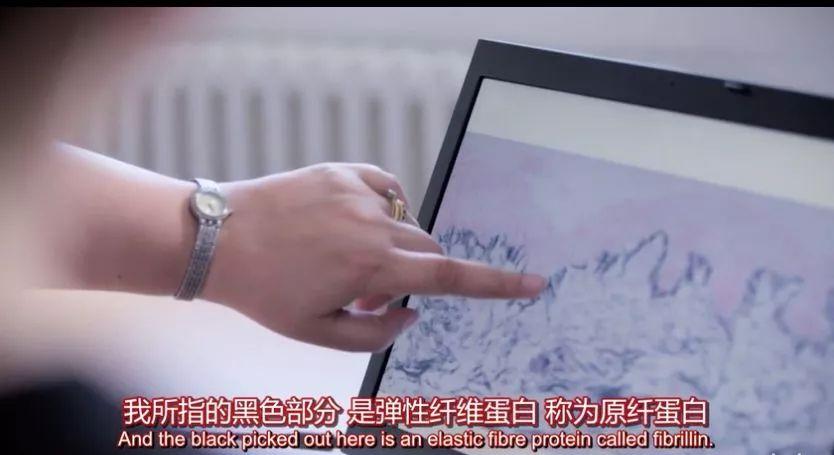 據(jù)片中教授所說,原纖蛋白,是皮膚外部的支撐,能保持肌膚緊致。而當皮膚長時間暴曬時,原纖蛋白被破壞,肌膚失去支撐,就會產(chǎn)生皺紋。