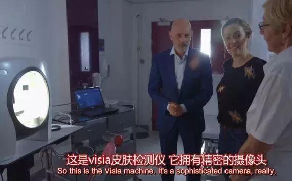 為了探尋可以防衰老的秘密,Cherry 找到了英國皮膚科醫(yī)生,在醫(yī)院用皮膚測試儀測試了肌膚狀態(tài)。