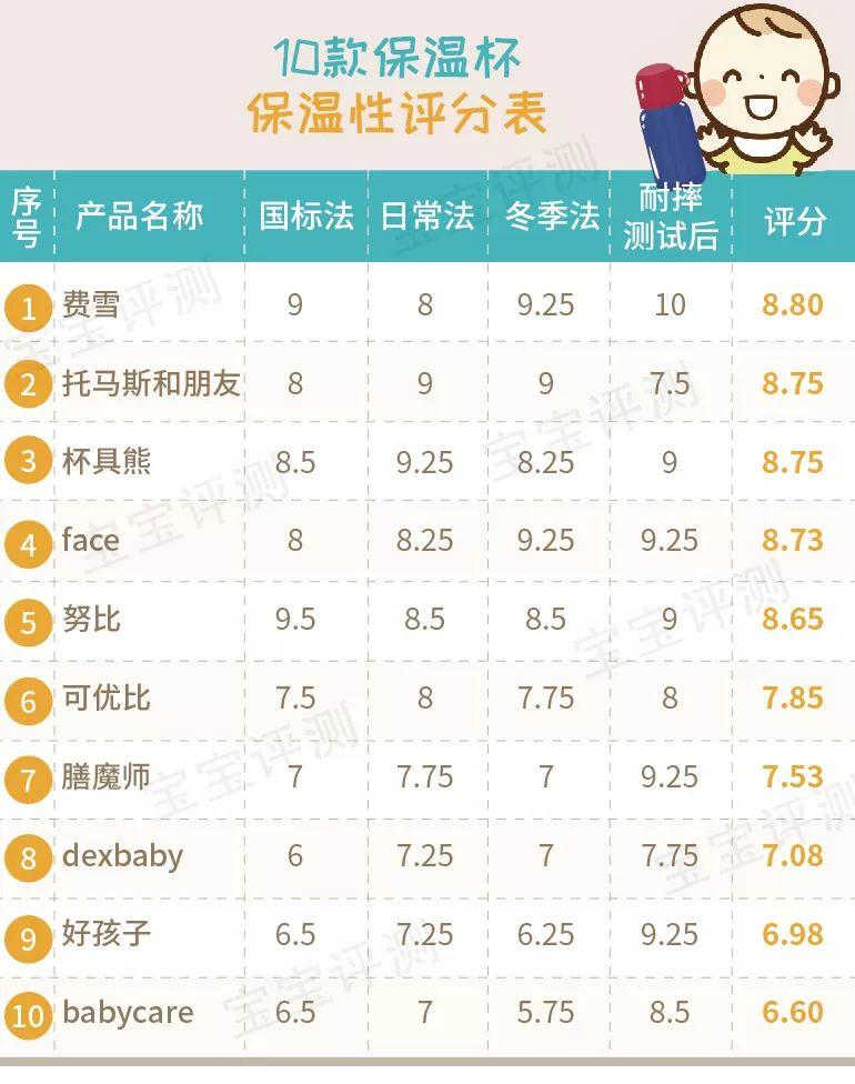 綜合以上4項(xiàng)測(cè)評(píng),10款保溫杯的保溫性綜合測(cè)評(píng)得分如下(滿分10分):