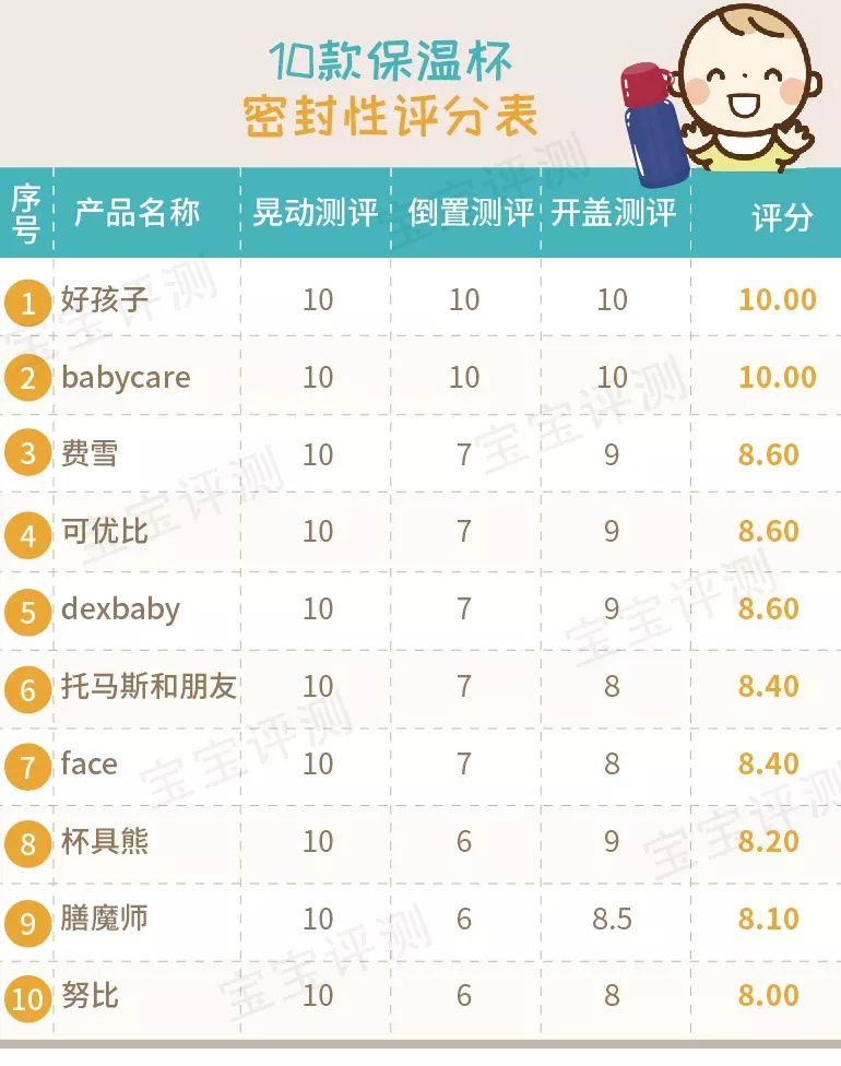 綜合以上3項(xiàng)測(cè)評(píng),10款保溫杯的密封性綜合測(cè)評(píng)得分如下(滿分10分):