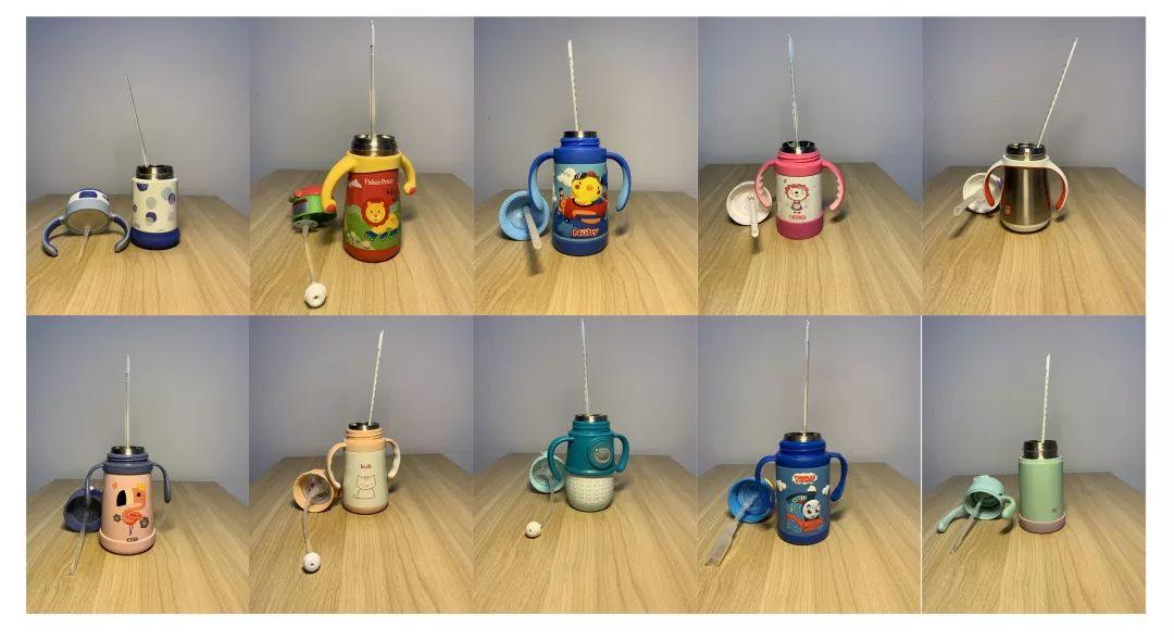 3、10款保溫杯均帶有吸嘴和吸管,寶寶可以拿在手里自己喝水。其中,3款帶有重力球,7款不帶重力球。