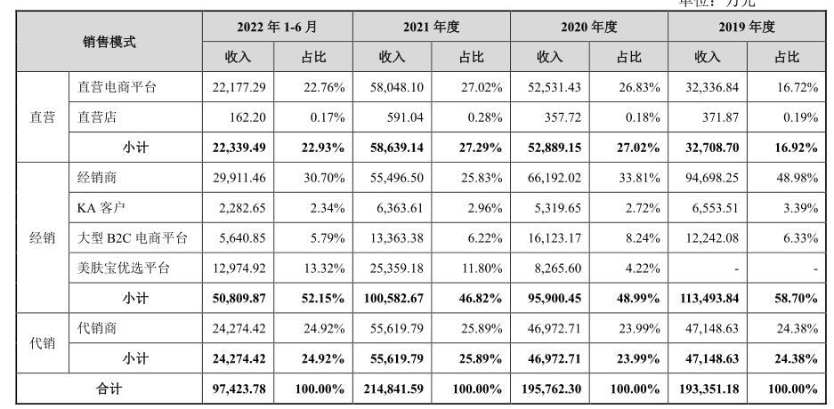 從營(yíng)收占比來看,經(jīng)銷模式貢獻(xiàn)的收入占到5成以上。2019年,環(huán)亞科技通過經(jīng)銷模式獲得的收入11.34億元,占主營(yíng)業(yè)務(wù)收入的58.7%。隨著這些年KA渠道和經(jīng)銷商等的采購(gòu)金額下滑,到2022年上半年,經(jīng)銷模式帶來的收入為5.08億元,占比降至52.15%。