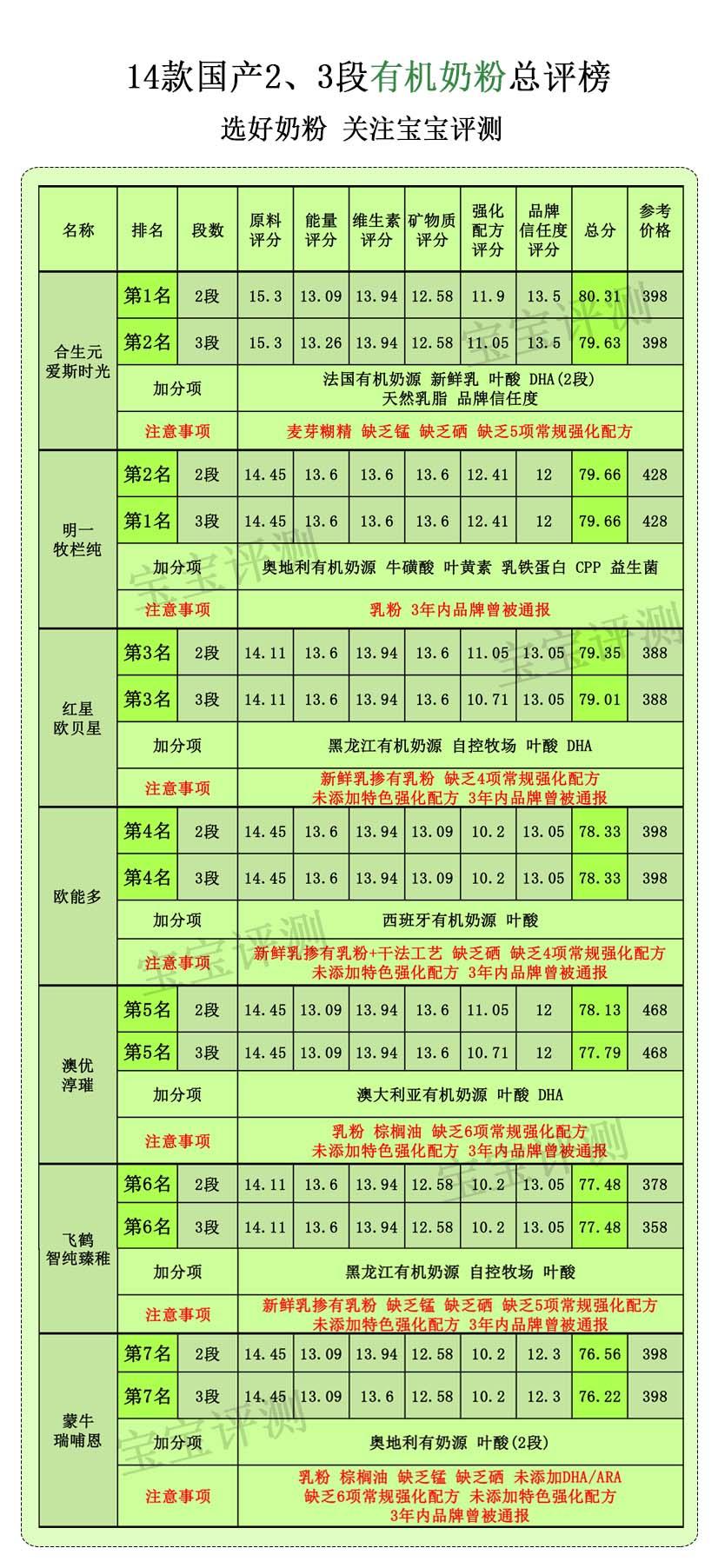 ①合生元愛斯時光、明一牧欄純、紅星歐貝星,這3款在國產(chǎn)有機奶粉1、2、3段橫評中均排在前3位。