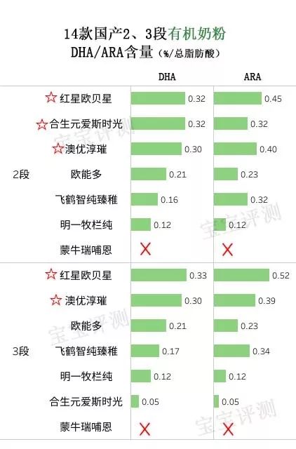②紅星歐貝星2-3段、澳優(yōu)淳璀2-3段、合生元愛斯時光2段,DHA添加量較高,得到額外加分(☆)。