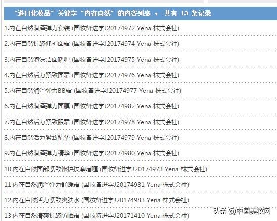 另外,在食品藥品監(jiān)督管理局官網(wǎng)查詢“內(nèi)在自然”可見(jiàn),品牌相關(guān)產(chǎn)品包括防曬、BB霜、面霜、眼霜、面膜、精華等共計(jì)13款產(chǎn)品均由韓國(guó)Yena株式會(huì)社生產(chǎn)。