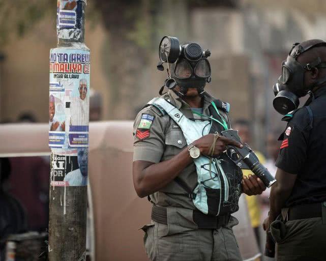 ▲非洲黑叔叔把防毒面具當成了頭盔