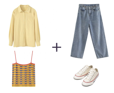 1、民族風吊帶+防曬襯衫+牛仔闊腿褲